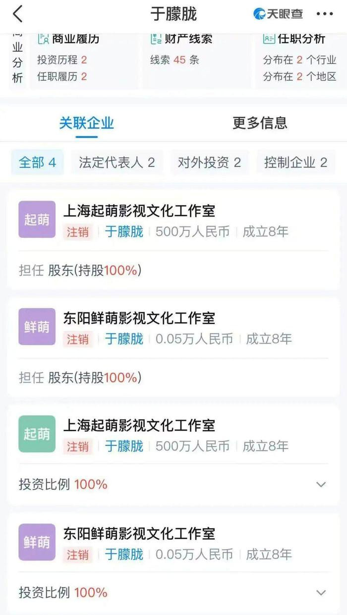天眼查显示,于朦胧名下所有持股公司均显示注销,时间分别在去年年底和今年7月。