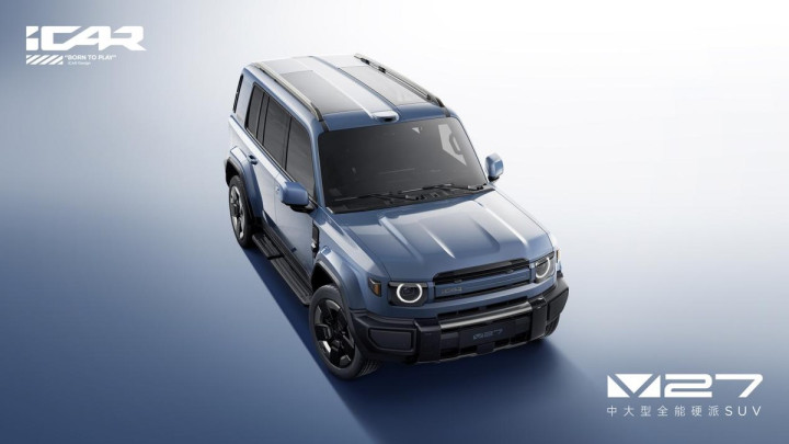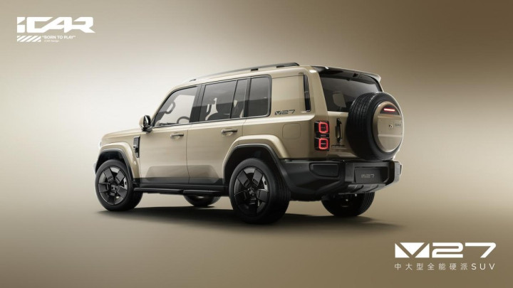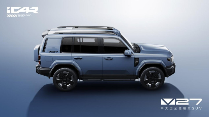 在外观造型方面,V27延续了iCAR V系列“复古基因+现代科技”的原创设计语言,以大量平直线条贯穿车身,搭配超大面积侧窗和低窗线设计,让整车视觉感受更协调舒展。iCAR V23上的车尾盲窗、车头侧面集成NFC模块和摄像头的“机能模块”等家族化设计元素得以延续,将经典硬派造型与先锋科技完美融合。新车车顶还搭载了造型独特的长条形双天幕,造型酷似战斗机座舱,给这款中大型方盒子SUV增添了更多运动气息。